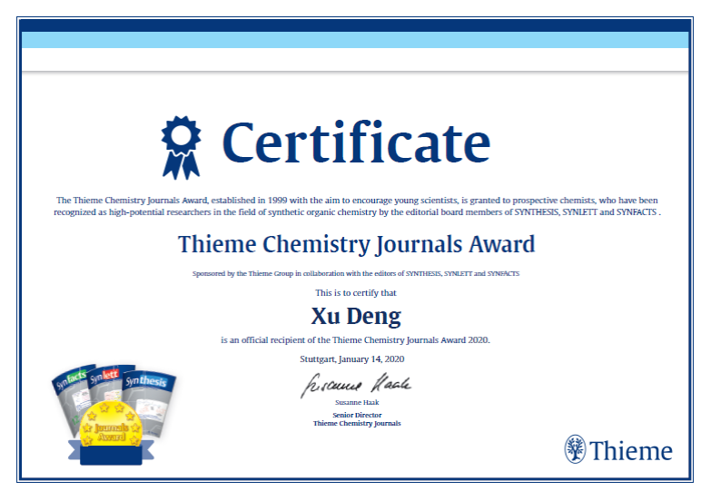 近日,球王会邓旭副教授荣获2020年度“Thieme Chemistry Journal Award”国际学术奖。该奖项是由德国Thieme Group(德国蒂莫出版集团)于1999年首次设立,每年颁发一次,由德…